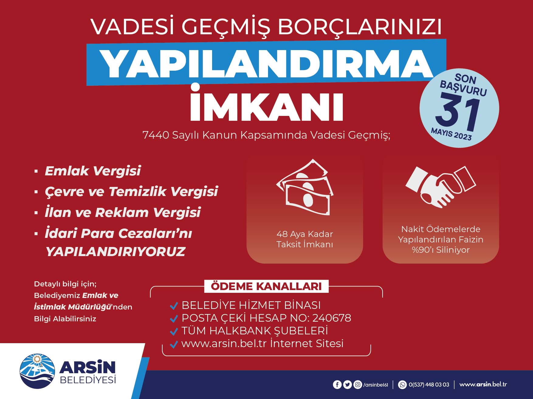 Belediyemize ait vergi borçlarınızın yapılandırılmasına ilişkin kanun aşağıdaki linkte yayımlanmıştır. Detaylarına ilgili ekten ulaşabilirsiniz.