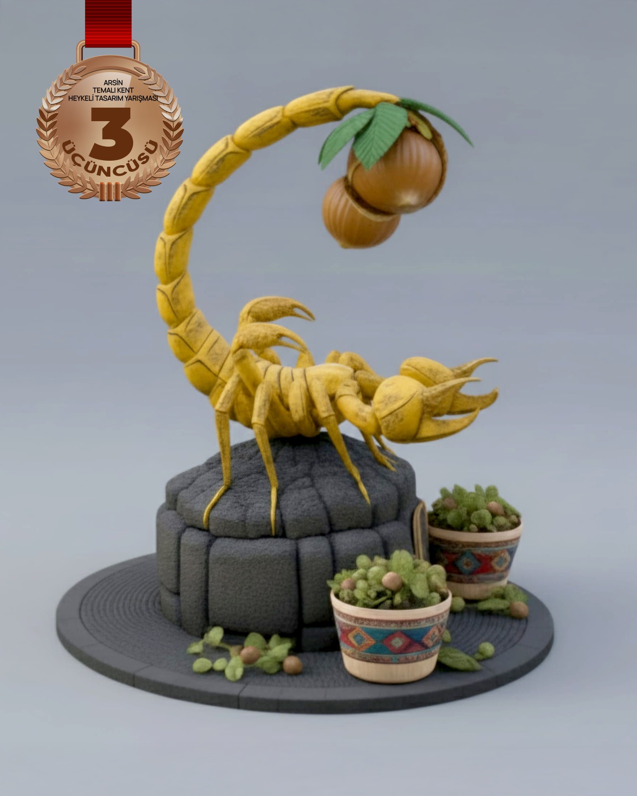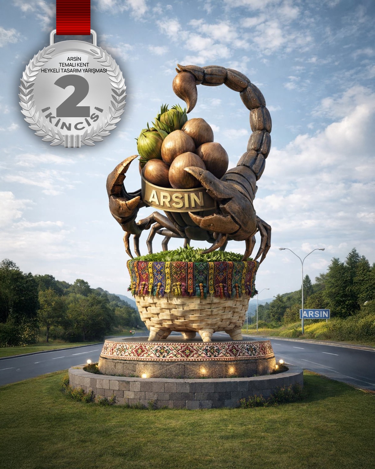 ALTIN KABUK KENT HEYKELİ PROJE AÇIKLAMASI: “Bu heykel, fındığı sadece bir ürün değil, Arsin’in toprağından doğan stratejik bir güç ve kıymetli bir "altın" olarak simgeler. Akrep figürü, bu coğrafyanın dayanıklılığını ve dünyaca ünlü Foşa fındığının koruyucu zırhını temsil eder. Kuyruğunda bir mücevher gibi taşınan fındıklar, emeğin sabırla işlenip zirveye taşınmasını; geleneksel motifli kaplar ise köklü Karadeniz kültürünü betimler.”