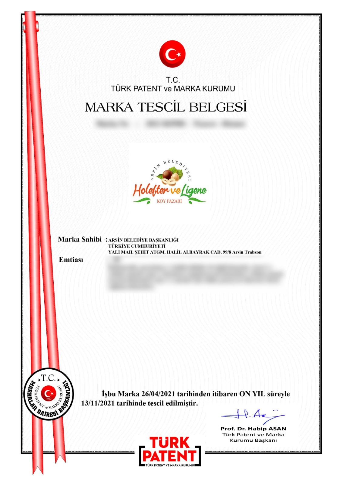 Arsin Belediyesi Holefter ve Ligene Köy Pazarı'na kurulduğu günden itibaren büyük destek veren Arsin Belediye Başkanı Muhammet Sait Gürsoy desteğini bir ileri aşamaya taşıyarak Arsin Belediyesi adına marka tescil başvurusunda bulunarak köy pazarının tescilini aldı.