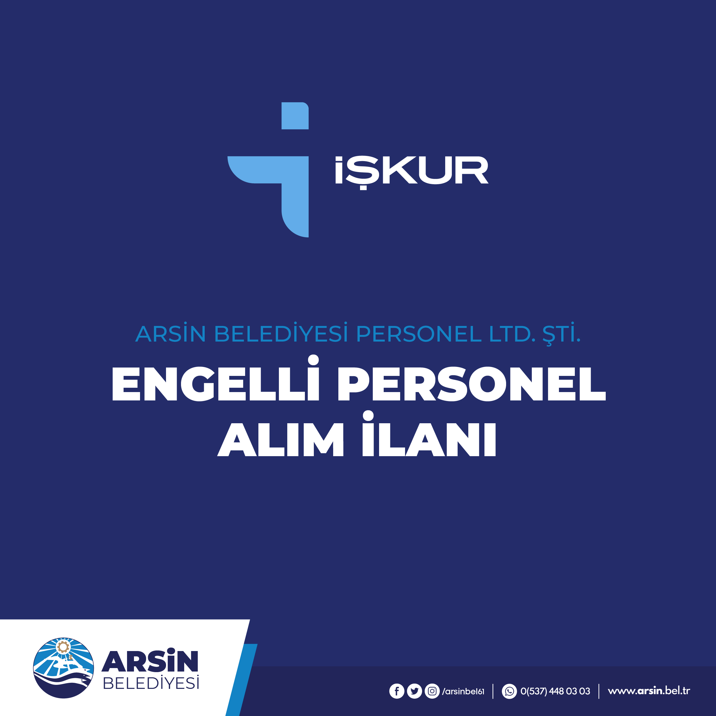 ARSİN BELEDİYESİ PERSONEL İŞLERİ LTD. ŞTİ de çalışmak üzere ,en az lise mezunu ,18-40 yaş aralığında ,bilgisayar işletmeni sertifikasına sahip ENGELLİ BÜRO İŞÇİSİ alınacaktır.(Yemek ücreti toplu iş sözleşmesi kapsamında ödenecektir:)