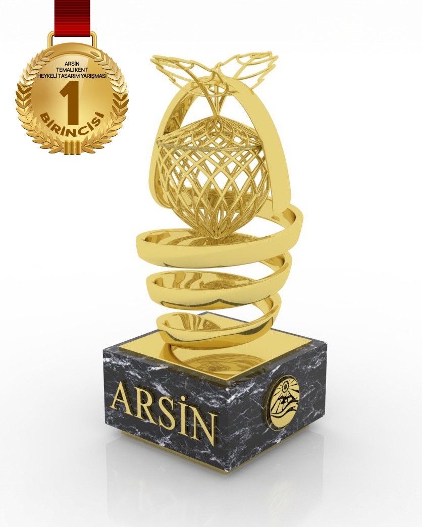 FOŞA’NIN DÖNGÜSÜ PROJE AÇIKLAMASI: Foşa’nın Döngüsü proje açıklaması şu şekilde: “Foşa’nın Döngüsü adlı bu kent heykeli, Arsin’in coğrafi işaretli ürünü olan Foşa Fındığını merkeze alarak, ilçenin üretim kültürünü, sürekliliğini ve kent kimliğini çağdaş bir heykel diliyle görünür kılmayı amaçlamaktadır. Arsin’i fiziksel olarak deneyimlememiş bir tasarımcı bakışıyla geliştirilen bu proje, kente dair anlatının semboller üzerinden okunabileceği evrensel bir form arayışının ürünüdür. Heykelin ana formunu oluşturan yukarı doğru yükselen spiral kuşak, Arsin’in tarımsal emeğinin sürekliliğini ve döngüsel yapısını temsil eder. Bu spiral hareket, fındığın doğadan başlayıp ürüne dönüşen yolculuğunu simgesel olarak ifade ederken, izleyicinin gözünü heykelin merkezine doğru yönlendirir. Merkezde konumlanan Foşa fındığı formu, keşan motiflerinden esinlenerek tasarlanmış sepet dokusu ile çevrelenmiştir. Bu sepet formu, hem geleneksel el sanatlarına bir gönderme yapmakta hem de fındığın korunması ve değer kazanması fikrini simgelemektedir. Heykelin üst bölümünde yer alan çotanak detayı, Foşa fındığının doğal formuna doğrudan referans verirken, tasarımın kökenini toprağa ve doğaya bağlayan güçlü bir sembol oluşturur. Alt kaidede kullanılan koyu renkli taş doku, heykelin altın tonlu üst formu ile bilinçli bir kontrast kurarak hem sağlamlık hem de kalıcılık vurgusu yapar. Kaide üzerinde yer alan ‘Arsin’ yazısı, heykelin kentsel aidiyetini açık ve net biçimde tanımlar. Foşa’nın Döngüsü; estetik, uygulanabilir ve sürdürülebilir bir kent simgesi olarak Arsin’in kimliğini çağdaş bir yorumla temsil etmeyi hedeflemektedir.”
