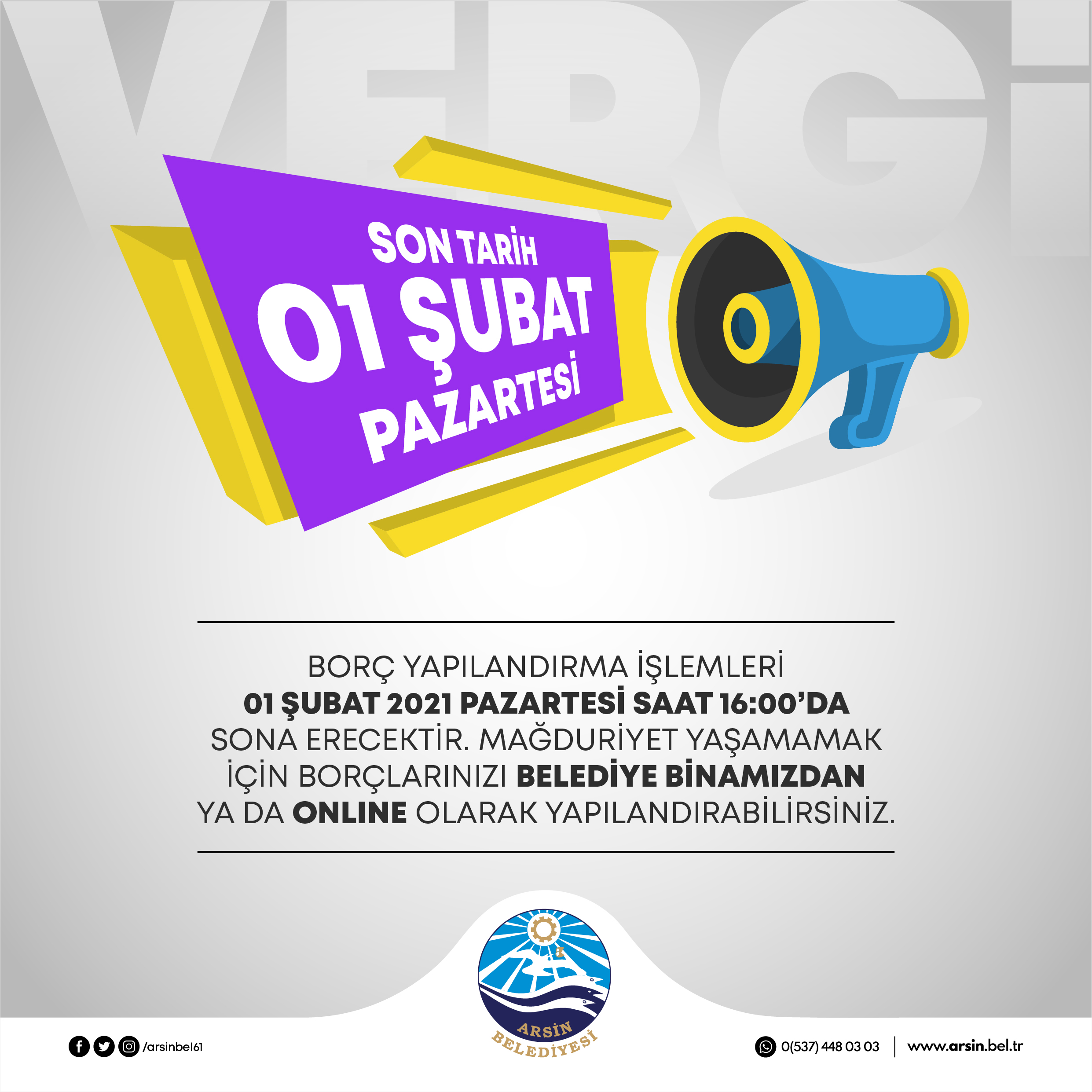7256 SAYILI KANUN KAPSAMINDA BORÇLAR YAPILANDIRILMAKTA VE PEŞİN ÖDEMELERDE FAİZİN %90'I SİLİNMEKTEDİR. 01.02.2021 PAZARTESİ SAAT 16.00'YA KADAR ARSİN BELEDİYESİ TAHSİLAT BÜROSUNA GELEREK MÜRACAATINIZI YAPABİLİR VE ÖDEMELERİNİZİ 18 AYA KADAR TAKSİTLENDİREBİLİRSİNİZ. BELEDİYE BİNASINA GELMEDEN TAKSİTLENDİRME YAPMAK İÇİN AŞAĞIDA YER ALAN İNTERNET SİTESİNDEKİ ADIMLARI İZLEYEBİLİRSİNİZ.