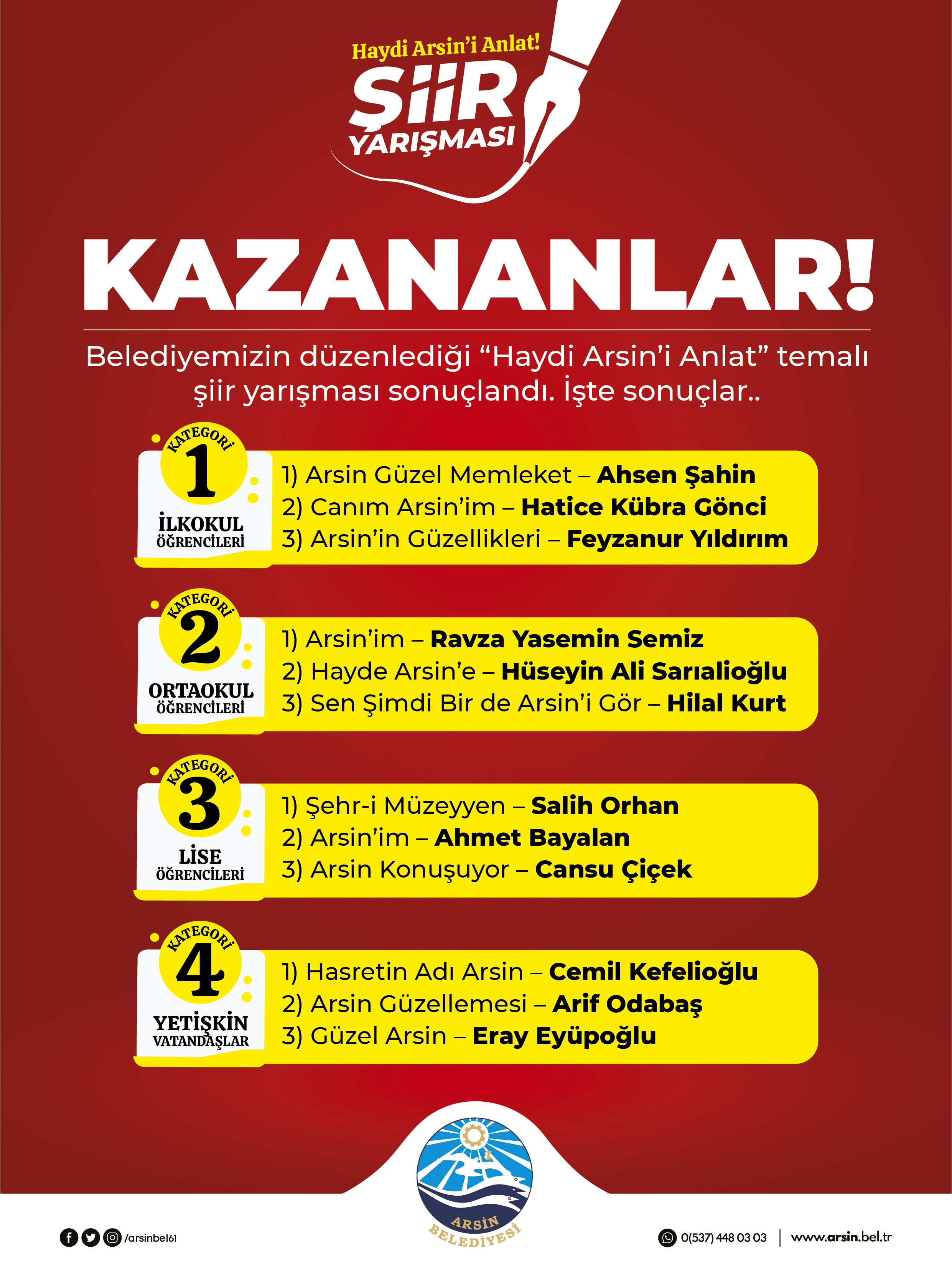Arsin Belediyesi tarafından 4 ayrı kategoride düzenlenen 'Haydi Arsin'i Anlat' temalı şiir yarışması sonuçlandı. İlkokul, ortaokul, lise ve yetişkin kategorilerinde teslim alınan şiirler oluşturulan komisyon tarafından titizlilikle incelendi. Yapılan incelemelerin ve kategorize işlemlerinin ardından kazananlar belirlendi. İşte kazananların listesi;